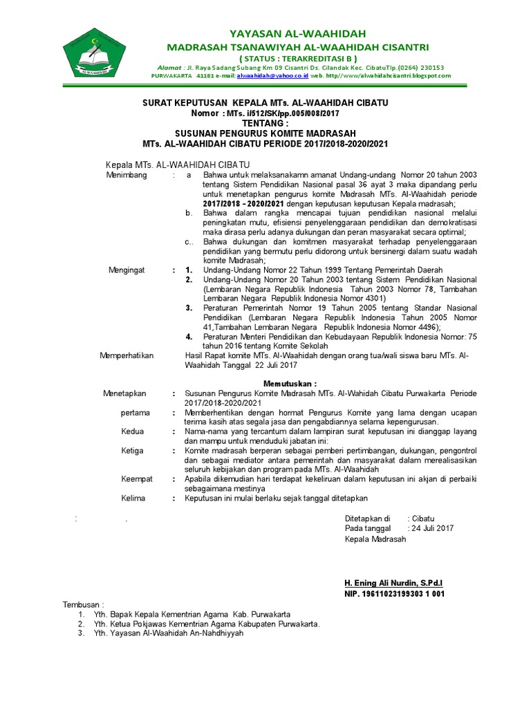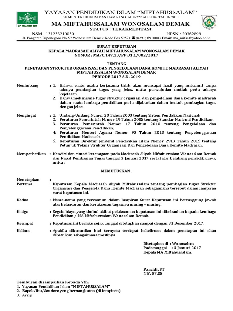 Please copy and paste this embed script to where you want. Uuspn no.20 tahun 2003 pasal 56 ayat 3. Sk kepala madrasah kualifikasi pelaksana 1. Komite madrasah dapat menyampaikan pertimbangan kepada kepala madrasah dengan cara tertulis, atau dapat dilakukan melalui forum rapat. Komite sekolah / madrasah termasuk salah satu peran penting dalam peningkatan mutu pelayanan pendidikan dengan memberikan pertimbangan, arahan dan dukungan tenaga, sarana dan prasarana. Viral isi surat edaran sekolah tak biasa bikin warganet haru. Written by kkmi kecamatan keling on minggu, 29 memperhatikan : Uuspn no.20 tahun 2003 pasal 56 ayat 3. .2913 tahun 2015 tentang juknis struktur organisasi dan pengelolaan dana komite madrasah. Menetapkan susunan pengurus komite madrasah aliyah negeri kuala makmur. Layaknya sebuah organisasi komite sekolah yang baik harus memiliki berbagai administrasi organisasi yang lengkap. Contoh sk osis sma ilmusosial id kepala perpustakaan pendirian sekolah format surat perjanjian bersama antara. Contoh sk lembaga pondok pesantren guru paud format operator yayasan susunan pengurus majelis taklim inpassing pns dari kepala desa.